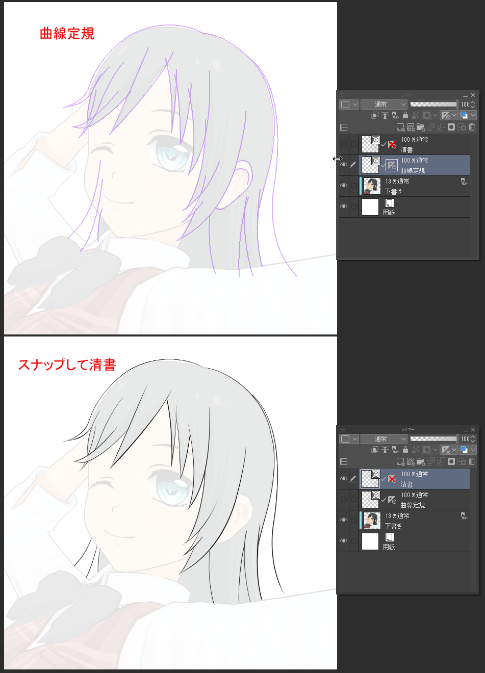 Web 綺麗な線画を描くコツとして、よく紹介されるのは大きくわけて三つ! 『ストロークは長く描く!』 『ブツブツと描かずに一気に描く!』 『線の強弱をつける!』 これがWeb 綺麗な線画を描くコツを紹介するよ! デジタルペン入れが苦手な方へ 綺麗な線画を描くコツ①下絵をなぞるのではなく一気に描く 綺麗な線画を描くコツ②クリスタのベク